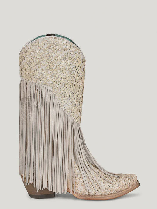 CORRAL Women's C3955 OVERLAY EMBROIDERY LAMB FRINGE WHITE SNIP TOE COWBOY BOOT SS23