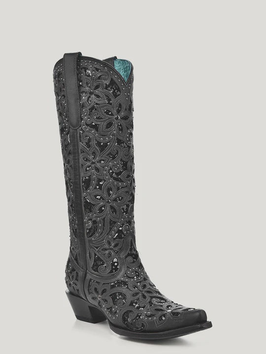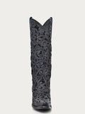 A3589 - WOMEN'S BLACK GLITTER INLAY FLORAL OVERLAY WITH CRYSTALS AND STUDS SNIP TOE TALL TOP BLACK COWBOY BOOT