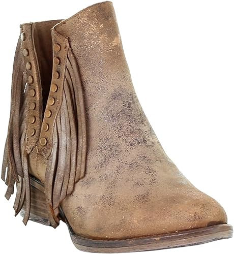 - Scoured leather upper with a distressed patina, circular gold metallic accents, and leather fringe.