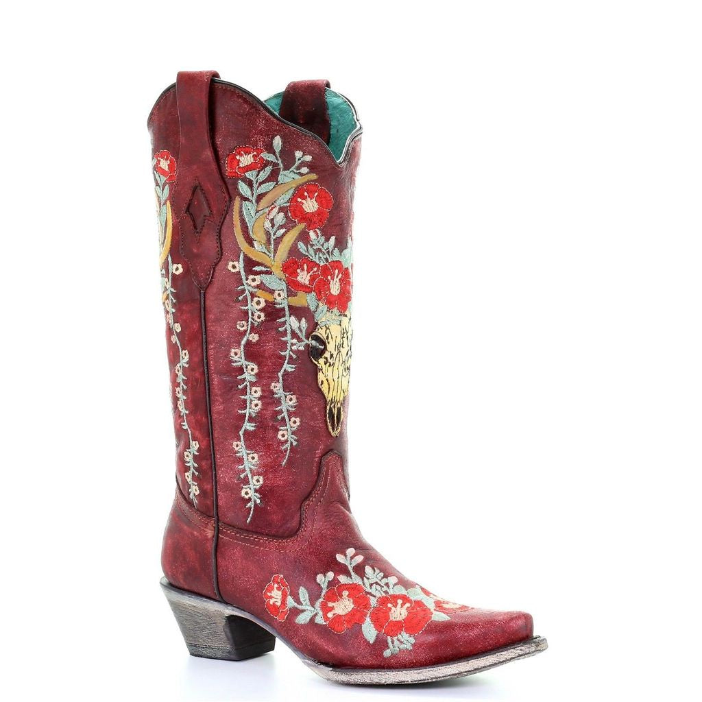 This Corral boots design sells like crazy in both shades of brown, so we jumped at the chance to bring you this style in red! This little number features stunning distressed red leather accented with deer skull overlay and floral embroidery. Tube Height 13" Heel Height 2"Snip Toe