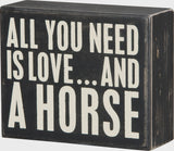 A classic black and white wooden box sign featuring a distressed "All You Need Is Love… And A Horse" sentiment. Easy to hang or can free-stand alone.