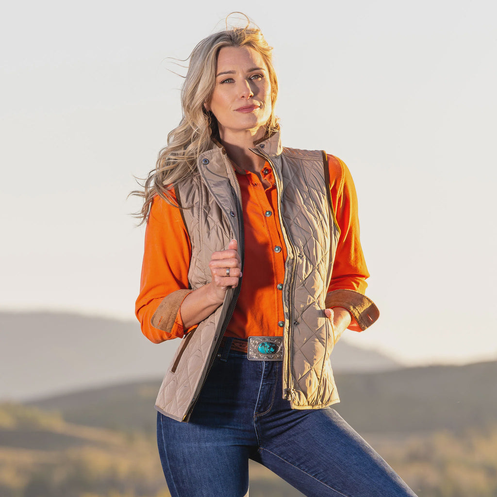 The Vista Vest is a stylish yet functional layer designed for those who appreciate the blend of elegance and versatility. With a gorgeous feminine cut that will flatter every shape, this vest is crafted from lightweight nylon with a diamond-quilted pattern, offering warmth without bulk. The zip front closure is complemented by a storm flap with Madison Creek's signature "MC" branded pewter snaps, while the contrast microsuede trim adds a touch of refinement. The belted adjustable back allows for a tailored silhouette, and the two lower slant pockets with magnet closures provide both convenience and a sleek finish. Available in Black, Gunmetal, and Khaki, the Vista Vest offers versatile color options that seamlessly complement any wardrobe.