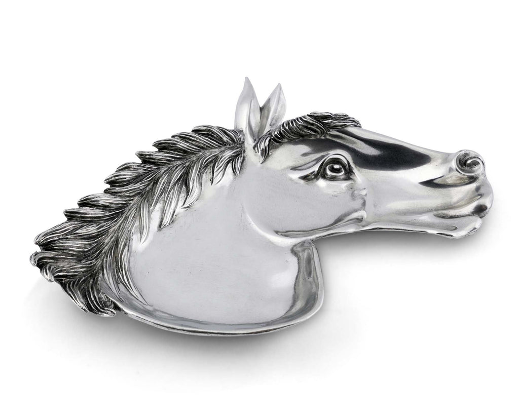 For the horse lover who has everything, the Horse Head Catchall holds all the little things. Cast in a hand-carved mold by a master equestrian artist, this piece displays incredible realism in the features of its design. The stallion's thick, intricate mane makes up one edge of the tray as the figural hair runs through the middle of its perky ears. Muscles show in the horse's face and neck as its beautifully defined eyes look off into the distance. Please call our professional Vagabond House Experts for more information at (888) 855-9041 or email sales@Saratogasaddlery.com
