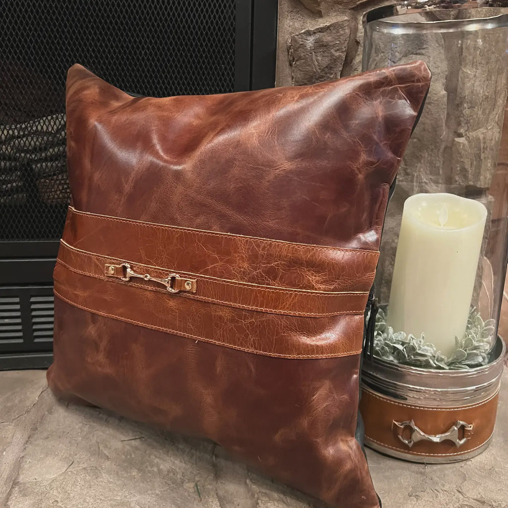 Made in Argentina, these 18” pillows have a beautiful patina on the cowhide leather. The pillow features a center strip of coordinating leather, finished with a gold snaffle bit and hardware. Full leather back with center zip. These pillows perfectly match our cowhide snaffle bit pillows. We recommend filling the pillow with a 20” pillow insert.