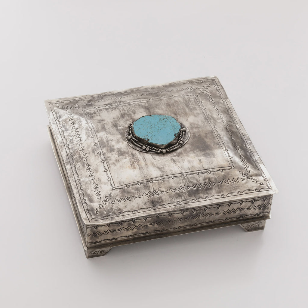 the J. Alexander Rustic Silver stamped box with turquoise centerpiece, a stunning addition to any home decor. Crafted with the utmost attention to detail, this hand-tooled treasure box is the perfect catch-all for your cherished keepsakes. The luxurious velvet lining and turquoise stone centerpiece add a touch of Southwestern style to your space.