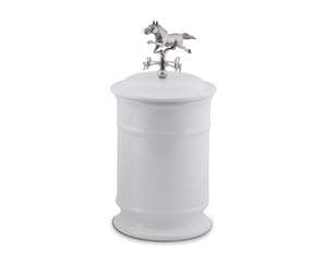 A galloping steed Weathervane finial, crafted from luxury pewter tops Vagabond House's stoneware canister. This unique canister adds a perfect touch of equestrian country style to your kitchen. The canisters are perfect for sugar, specialty flours or sweet treats. Crafted in fine stoneware, the canisters are double hand-glazed to a luminous, creamy white finish.