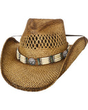 This straw hat from Bullhide has vintage western style with a wide leather hat band featuring bone and silver-tone beads and conchos. The straw hat also has a rugged burnished finish, crown ventilation and a handy stampede string to keep it in place.