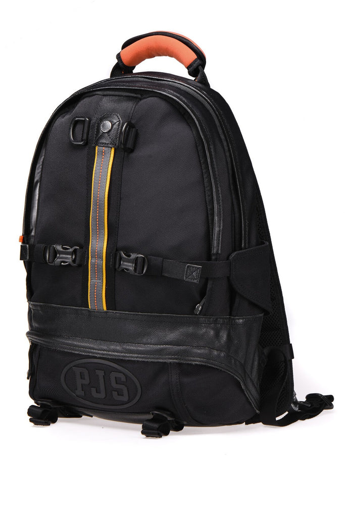 This Sturdy backpack with real leather details has multiple pockets inside and outside, including one padded laptop pocket and one bottom pocket. Padded grip handles. PJS hook on the right shoulder strap. PJS logo on the bottom at front. 15L (47 x 35 x 17)