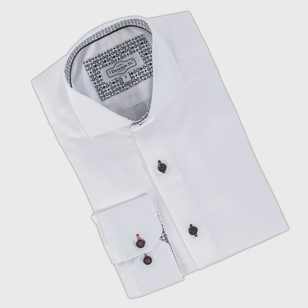 7 Downie Dress Shirt in Solid White with Black Buttons SS23