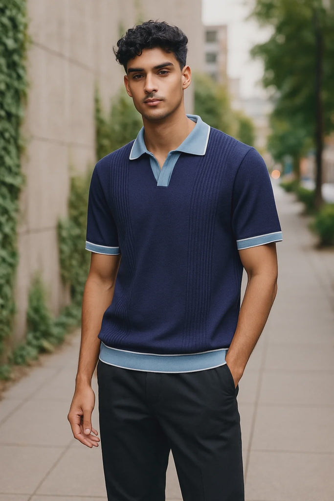 7 Downie Street Mens Johnny Collar Polo in Navy. This 1/4 Zip Knit polo shirt combines softness, stretch, and comfort, making it the ideal choice for any occasion. Crafted from a blend of 60% cotton and 40% acrylic, it offers a slim fit that flatters your silhouette. Pair it effortlessly with shorts for a casual outing or chinos for a more polished look. Embrace versatility and sophistication with this essential wardrobe staple.Â