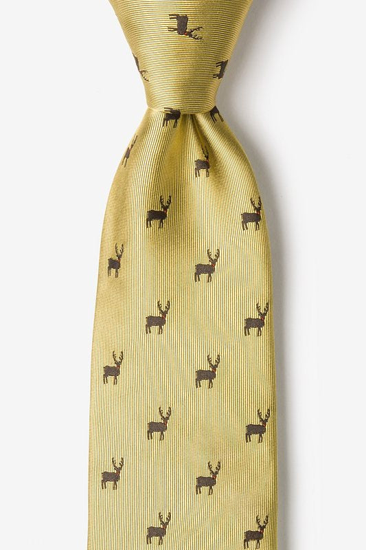 Alynns Mens Silk Holiday Tie In Gold With Reindeer Print.