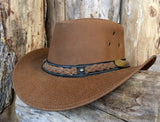 The Outback Survival Gear Buffalo Hats are extremely tough and durable and have a touch of "The West meets Outback" in style that is popular with both men and women. Â Made from 100% Water Buffalo, the leather has been split and oiled, giving it a rugged "rough-out" leather finish. Â The brim is rolled with a "mono-filament" memory cord so you can knock it around and it will bounce back to its original shape. Â One tough Hat!!