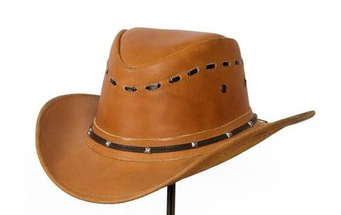 This stylish hat is made with a tough Buffalo Hide leather with beautiful laced stitching around the crown. Finished with our nice soft Coolmax sweat band makes this hat comfortable to wear all day. One of our few hats that comes with a fixed wire brim, to create your own attitude and style!