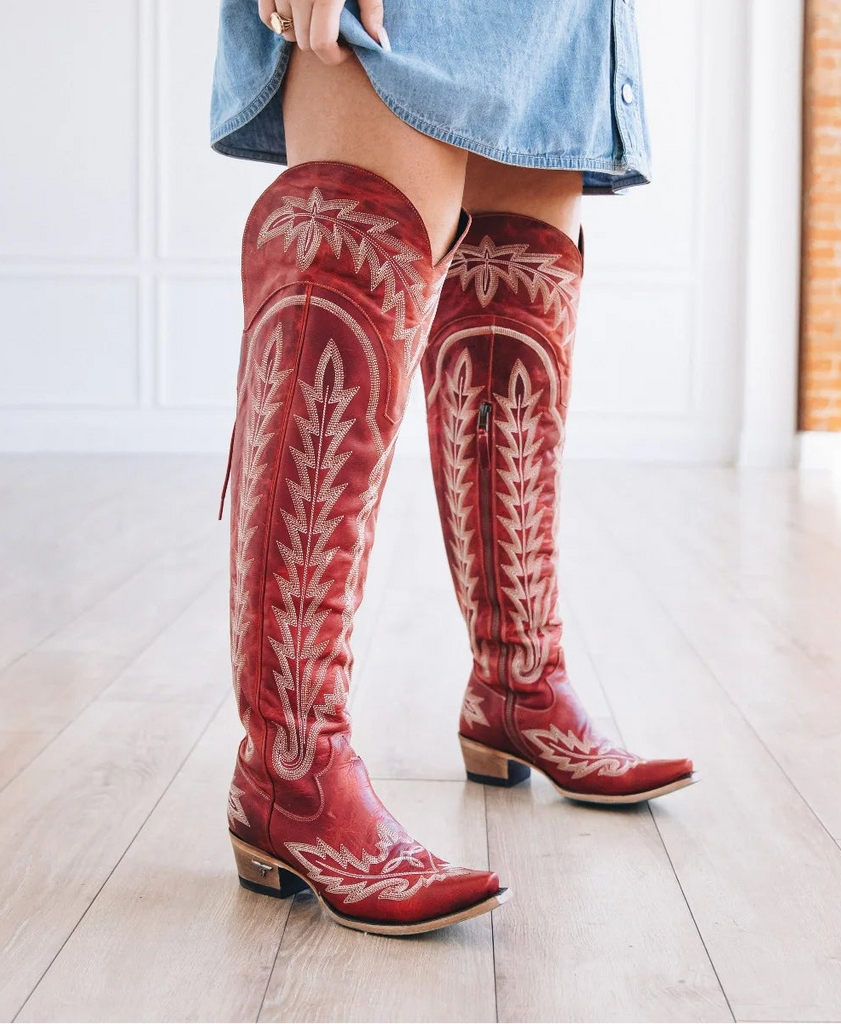 Heirloom quality with a core western influence. The classic snip toe profile is embroidered to perfection with a twist on traditional flame stitch and a functional corset back. The Lexington Knee-High is timeless and sexy all wrapped in one.