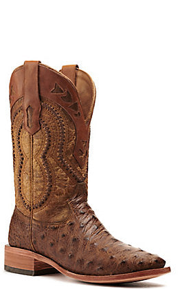 These Men's Corral Cowboy Boots have a weathered leather look in Honey Saddle Color. The Corral Square Toe boots in Ostrich features an overlayed and embroidered top and are finished with a Goodyear welt and cowhide outsole.