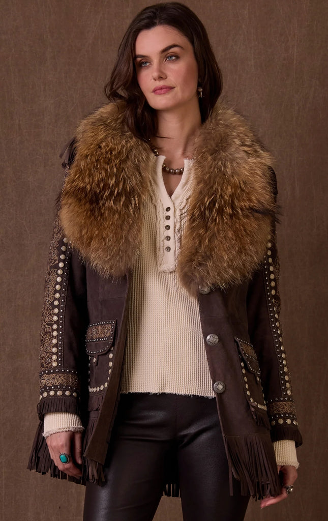 An instant collector, this stunning statement jacket is timeless enough to be a lifelong mainstay in your wardrobe, yet remarkable enough people will definitely remember it. The gorgeous sheep suede is in this season’s signature shade of ‘bronco’ brown, embellished with intricate embroidery and beadwork, accented by chic pearl snap trim. The elevated hits-below-the-hip silhouette is finished with fringe and complemented with a head-turning full volume fur collar.