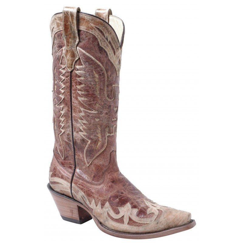 This women's Corral Antique Cognac/Cream Wingtip Eagle Boot features a full-grain, crackled and distressed leather vamp and shaft. The wingtip, Phoenix overlay and banded collar are saddle crackled distressed leather. The snip toe, leather sole and 2 1/8" fashion heel round out the fashion forward look of this cowboy boot.