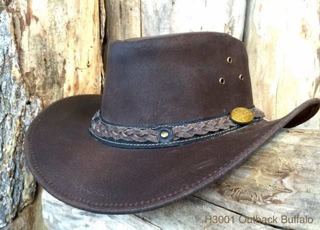 The Outback Survival Gear Buffalo Hats are extremely tough and durable and have a touch of "The West meets Outback" in style that is popular with both men and women. Â Made from 100% Water Buffalo, the leather has been split and oiled, giving it a rugged "rough-out" leather finish. Â The brim is rolled with a "mono-filament" memory cord so you can knock it around and it will bounce back to its original shape. Â One tough Hat!!