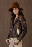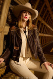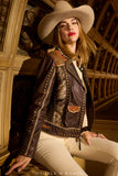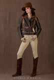 This season’s statement biker style Leather Jacket designed by Double D Ranch is an exquisite combination of chocolate leather and sienna suede, complemented with brindled animal hide and the focal point: a printed piece of artwork by celebrated cowboy artist Teal Blake. It’s embellished with heavy studding and contrast leather stitching. You are now fit for rodeo royalty!