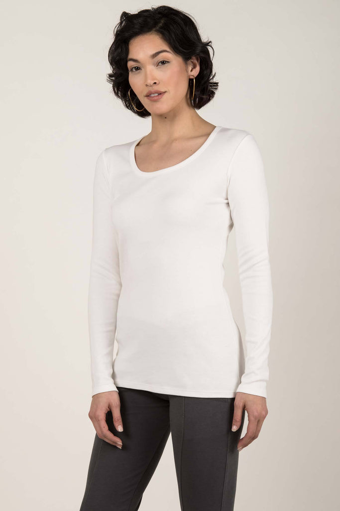 Our new Essential Long Sleeve Scoop Tee is a go-to for comfortable dressing all year long. With an elegant wide scoop neckline, and fitted style, this organic Pima cotton interlock top forms to your body. Whether layered under a poncho or sweater or worn on its own, it's the ultimate wardrobe staple - perfect for simplifying your wardrobe and simplifying your life.