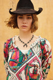The hues are harmonious and feminine, bringing out the boldness of pink and orange complemented with turquoise and teals, tempered with accents of black and a canvas of white. The imagery is ranch-style Western meets egalitarian equine arranged in a classic quilt and trimmed with retro polka dot detail, with vintage vibes with a fresh feel. Effortless elegance.
