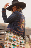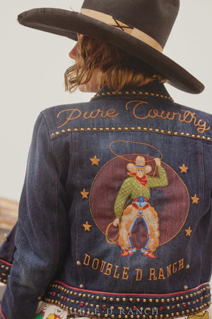 The distressed dark denim dazzles with eye-catching embroidery, statement studding with gemstone embellishments, and custom concho buttons. It’s the classic style you love in a jean jacket, but dripping with cowgirl charm.