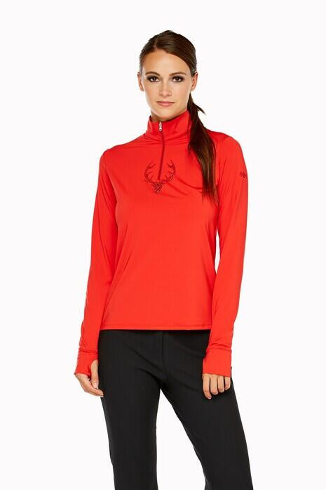 Technical base-layer extraordinaire! Hydrophilic stretch with a front-zip turtleneck, banded cuff with thumb loop. Encrusted with a sparkling deer designed in Swarovski® crystal on the front placket. Wear it on the ski slope, at the gym or simply with jeans. #Winteriscoming
