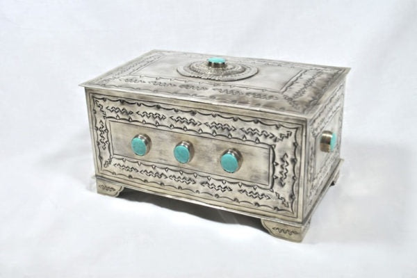 LG 9 Stone Box w Turq Introducing the J. Alexander Rustic Silver box, a stunning addition to your home decor. This hand-tooled treasure box is infused with Southwestern style and features a genuine turquoise stone centerpiece, handpicked for its exceptional quality. Each artisan-crafted box showcases a unique vintage finish, exuding an air of authenticity and timeless charm.