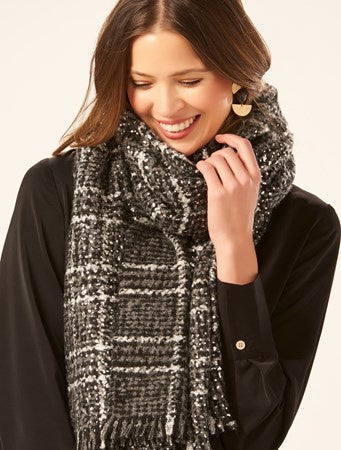 All-day warmth has never looked better. Wrap yourself in softness with this thick soft blanket scarf made with black plaid and metallic print detail. Keep yourself warm when cold weather hits.