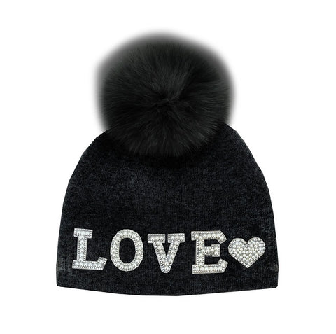 Mitchie's Black Knit "LOVE" Hat w/Pearls & Fox Fur HTA145 FW25
