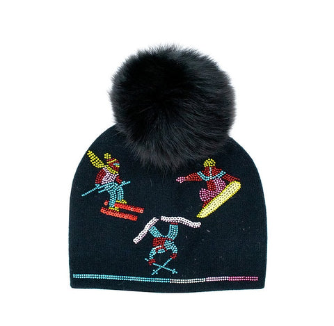 Mitchie's Black Beanie w/Crystal Skiers & Fox Fur HTA120 FW25