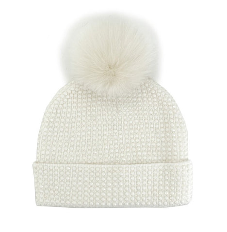 Mitchie's White Ski Vibes Beanie w/Pearl & Crystal Detail with Fox Fur HTA114 FW25