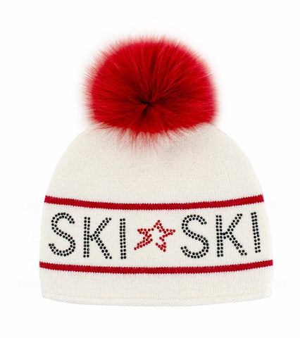 Mitchie's White/Red Knit "SKI" Hat w/Crystals & Red Fox Pom HTAN76 FW25