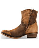 Perfect color and versatile styling make the Chocolate-Tan Lamb Abstract Short Top Boot from Corral a sure-fire winner. Hand-distressed and treated by expert craftsmen, tan undertones give every pair a unique look. A full length inside zipper and the short shaft allow for very easy on and off. A cushioned insole and leather outsole make this style a go-to short boot for every cowgirl.