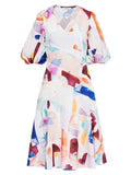 Whether you're dressing up for a special occasion or just want to add some fun to your everyday wardrobe, this dress is sure to do the trick. The allover watercolor print is eye-catching and vibrant, while the short blouson sleeves and flared skirt add a touch of flirtiness and movement.