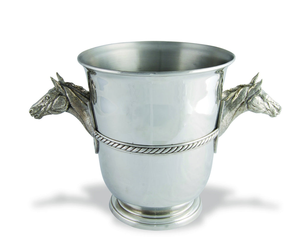Exquisite horse heads function as handles on this pure-pewter champagne bucket from Vagabond House. These realistically detailed thoroughbreds display within horseshoes on either side of this piece. Bands of figural rope wrap around the center of the bucket before connecting to the sides of each horseshoe.