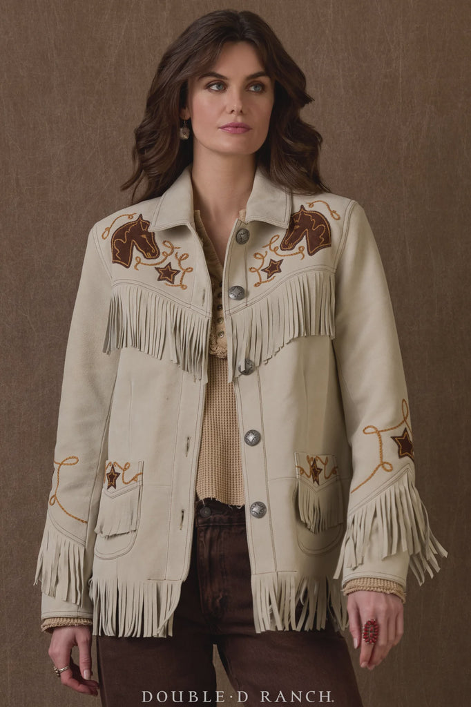 This dreamy Double D Ranch jacket is a gorgeous goat suede straight-cut silhouette with patch front pockets and a full placket of custom concho buttons, embellished with a retro-feeling rodeo motif of horses, stars, and rope-style chain stitching and finished with tonal fringe for some fun movement.