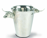 Deep and large enough to hold a magnum of wine, this attractive bucket has a brushed and hammered outer finish. Somewhat tapered, the bucket is finished with two detailed figural Long Horn Steer heads, which function as handles and start conversations!