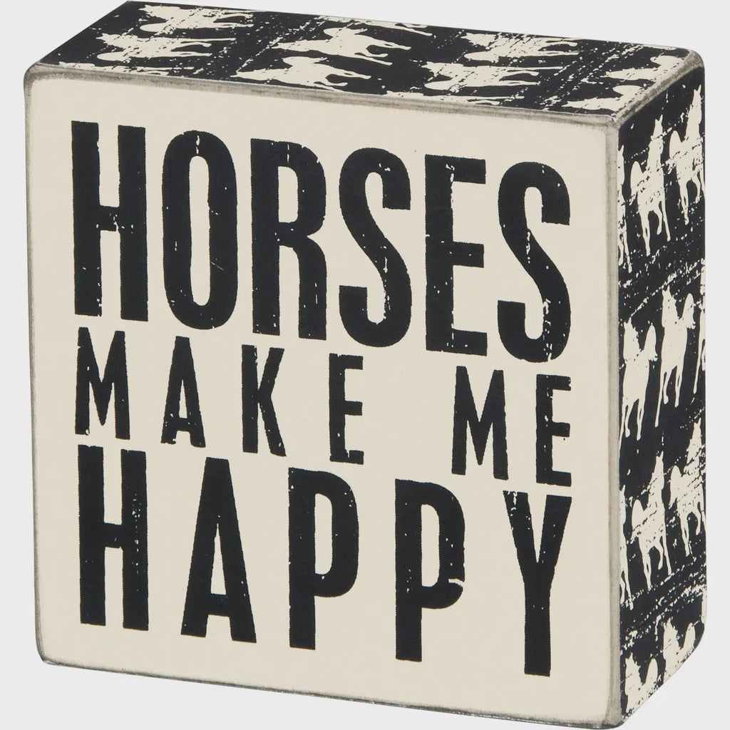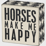 A classic black and white wooden box sign from our Box Sign Collection featuring a distressed "Horse Make Me Happy" sentiment with horse print trim designs. The Horses Make Me Happy sign is easy to hang or can free-stand alone. Dimensions: 1.8 x 4 x 4 in (4.4 x 10.2 x 10.2 cm)