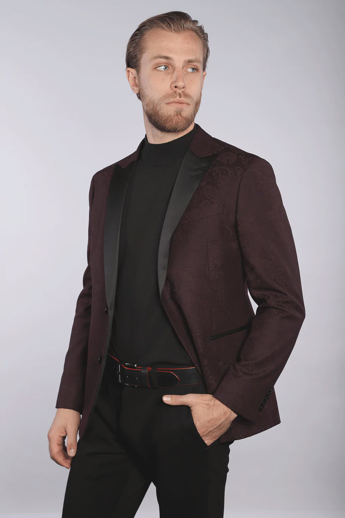 With burgundy being an essential colour to have in your fall wardrobe, you will no go amiss about wearing it on our beautiful paisley tuxedo jacket.