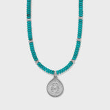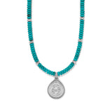 This turquoise Necklace is inspired by the beauty of the many colors of a vast sky. With artisan etchings and semi-precious turquoise-hued beads gives this necklace a southwest vibe to complete your western style.