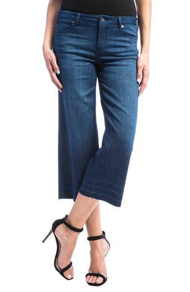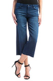 A fun, new style from Liverpool Jeans Company! High Waist, Release Hem, Cropped, Wide Leg Jeans featuring natural fraying on a creased, raw edge hem. Havasue Deep Blue. High rise, true size.