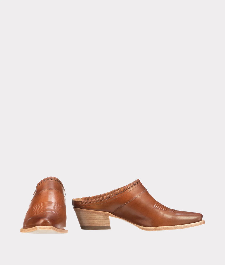 Kim is a Western mule handcrafted from Cowhide leather. Adorned with a whipstitch collar and ornate toe medallion.