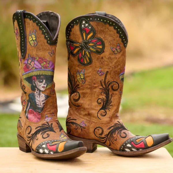 Old Gringo L3779-2 Boots Catarina in Brown An ode to the Day of the Dead, this boot is a piece of art to be adorned. Featuring La Catarina on distressed brown leather, with strokes of embroidery and leather overlay. For special occasions or when you want to feel fierce and confident, this is the perfect pair of cowgirl boots with a statement. Built on a classic cowgirl boot silhouette with a 13-inch shaft and a snip toe and cowboy heel.Â