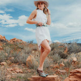 If you like unique and classy Western Lifestyle Fashion, check out these Old Gringo Quiroga Mule in Brass AQUA, designed for comfort and style. These quality mules are made of distressed brass leather with a turquoise overlay and a leather-stacked heel.