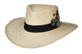 Draw the eye of everyone in the room when you walk in wearing this straw hat from Bullhide. This hat has Panama straw construction with a cluster of decorative conchos on the side. The wide brim will protect your face and eyes from harsh sun rays or pelting rain. Complete your western ensemble when you pull on this straw hat from Bullhide.