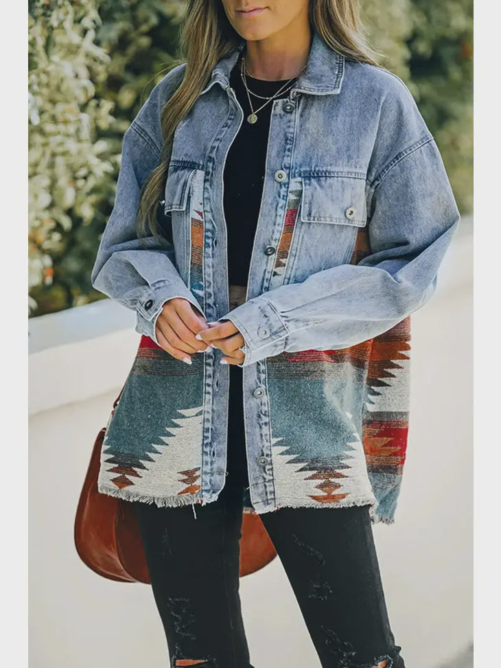 Aztec Splicing Buttons Up Denim Jacket Shacket Unishe Wholesale Size Chart (inch)
