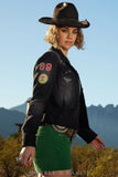 This dreamy jean jacket is a distressed black denim, the perfect canvas for eye-catching embroidery and applique of colorful characters and the DDR mantra “Play Nice, Be Free”. It’s finished with fun patches and custom concho buttons for a lightweight look you can rock year round.