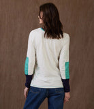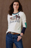 We love this classic cattle drive scene for this collection, giving it a pop of color really brings it to life in a cool way. This long-sleeved tee brings a new element to your everyday look with subtle ticking-inspired print and cool color-blocked cuffs.