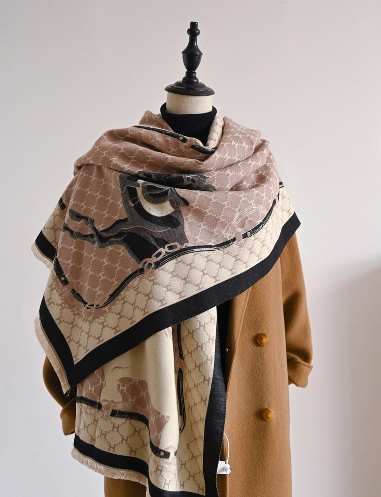 Equestrian Inspired Style Scarf in Black & Tan Rearing Horse Motive Wrap